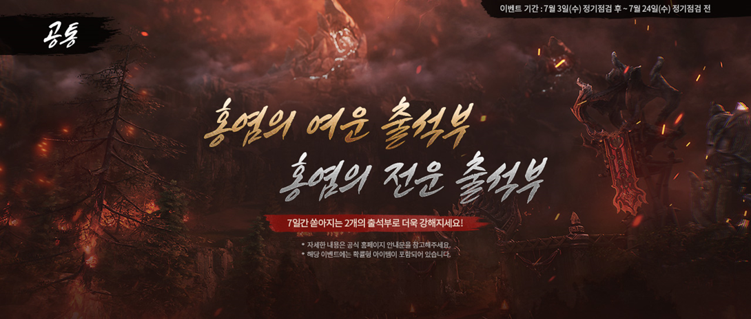 이벤트 | [이벤트] 홍염의 여운, 홍염의 전운 출석부 (공통) | 2024.07.03.. ~ 2024.07.21 | |