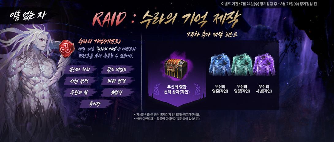 [이벤트] RAID : 수라의 기억 제작 (이름 없는 자) | 2024. 7. 24. ~ 2024. 8. 21. | |