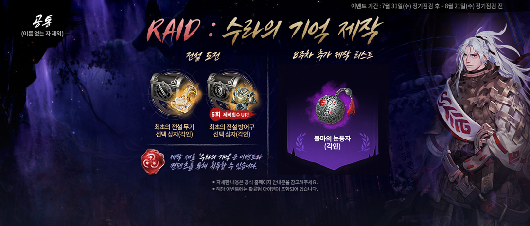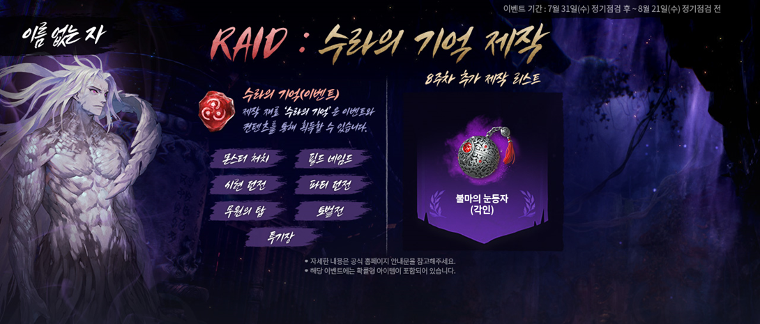 [이벤트] RAID : 수라의 기억 제작(공통)(이름없는자) | 2024. 7. 31. ~ 2024. 8. 21. | |