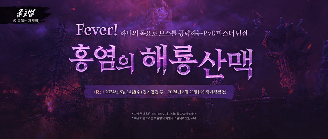 이벤트 | [이벤트] FEVER! 홍염의 해룡산맥 | 2024. 8. 14. ~ 2024. 8. 21 | |
