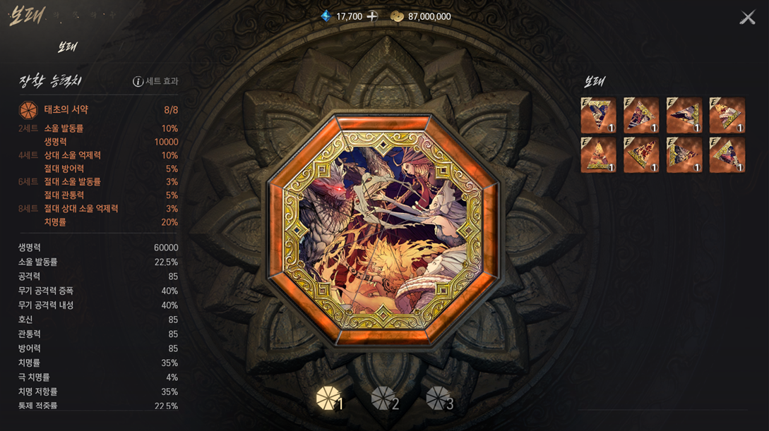 [칠흑]태초의 보패 8번(각인) | 상대 소울 억제력 11% 물약 회복률 7.5% 통제 적중률 17% 생명력 5500 절대 관통력 3.3% 압도 1% |