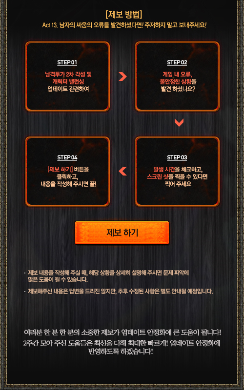 Act 13. 남자의 싸움 대규모 업데이트! 즐겁게 즐기고 계신가요? 혹시 플레이 도중 오류나 문제점을 발견하셨다면 바로 제보해주세요! 여러분의 제보가 업데이트 안정화에 큰 도움이 됩니다.제보 기간 : 2015년 06월 19일 (금) 점검 후 ~ 07월 03일 (금) 점검 전