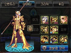 ▶ 모자 - 캐속(힘25x2) ▶ 얼굴 - 공속(공속1.5x2) ▶ 가슴 - 공속(공속1.5x2) ▶ 상의 - 신검(힘15물크1.5x2)[플티:마검발현] ▶ 하의 - 피맥(힘15물크1.5x2)[플티:마검발현] ▶ 허리 - 회피(적중1.5x2) ▶ 신발 - 힘신(이속1.5x2) 소마/노블레스/마제스티 8차레압 영혼셋 극찬듀 마검발현플티작. 소마8차