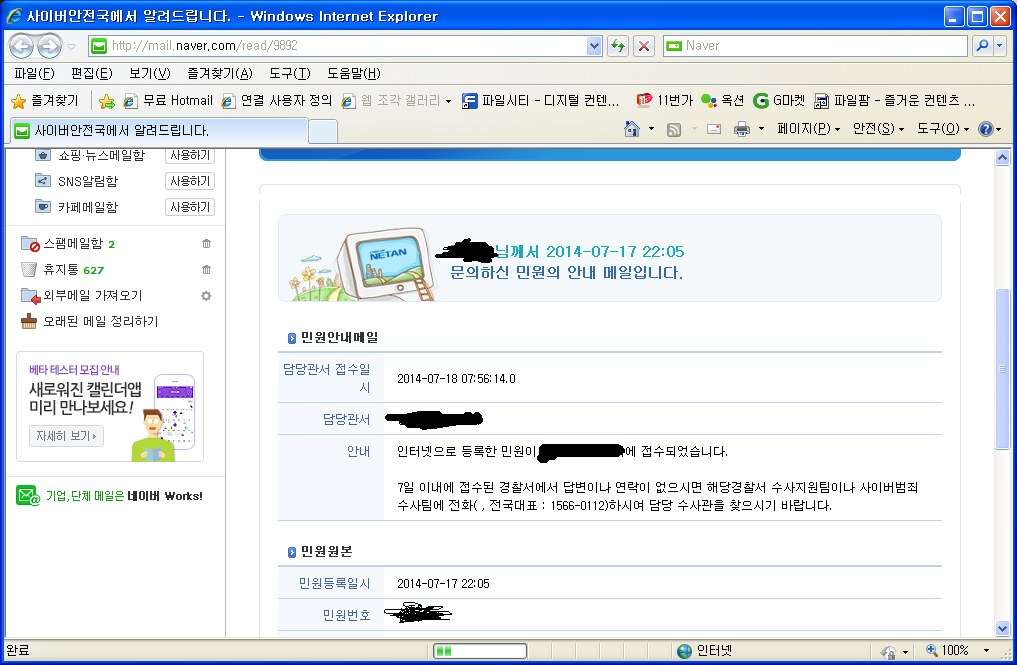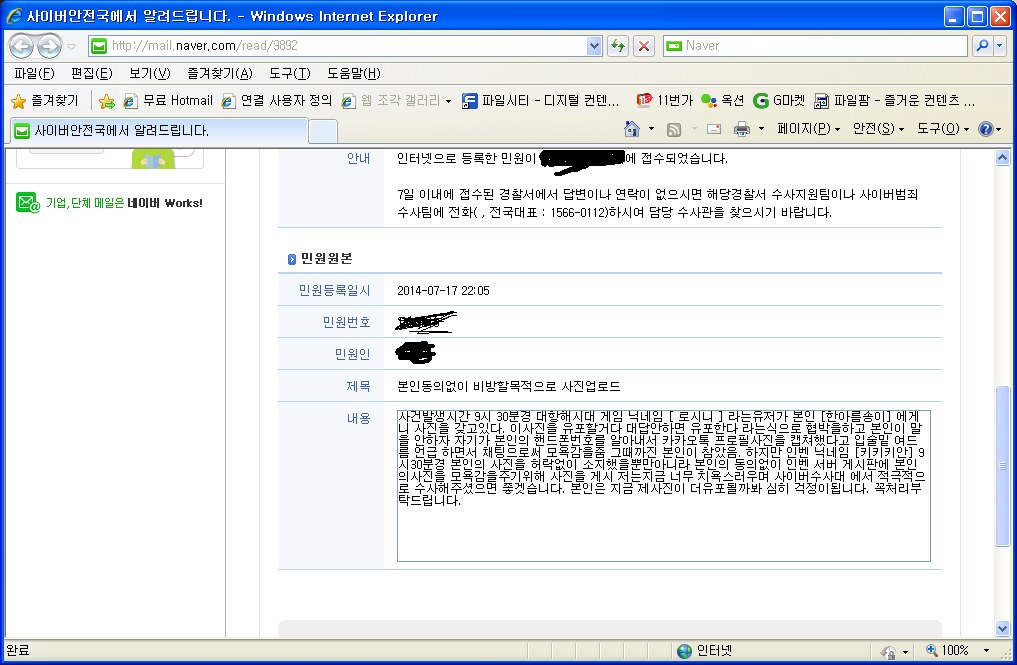 자 장난같죠 ㅎㅎ.. 내가 몇번몇번 참아주니깐 아주나를 개호구로보고 내얼굴을 대놓고올리시던데 음 로시니 [키키키안] 님 이젠끝을보죠 남자로써 제얼굴 지적하나하나 하시던데 뭐 얼마나 잘생기신 사람인가 얼굴한번 대면하시구요 오늘 경찰서 방문해서 진정서도 쓰고왓으니 저 메일대로라면 7일내에 사이버수사대에 신고한 민원이 경찰서에전해져서 다시연락이 온다는말인데 뭐.. 사이버수사대 전화 7일내로온다해도 안오는경우가 많다구요 ㅎㅎ? 안오면 제가직접다시 찾아가면되는 부분이구요 물론 전화도 하면되구요 아직까지 사과문하나 안올려진거보면 자기도 꿀릴거없고 무기가있다는뜻으로 끝까지가는걸로 알겠습니다 제가놀아주는 선안에서 저를 비방하시던가 하셔야죠 선을넘으면 안됩니다.