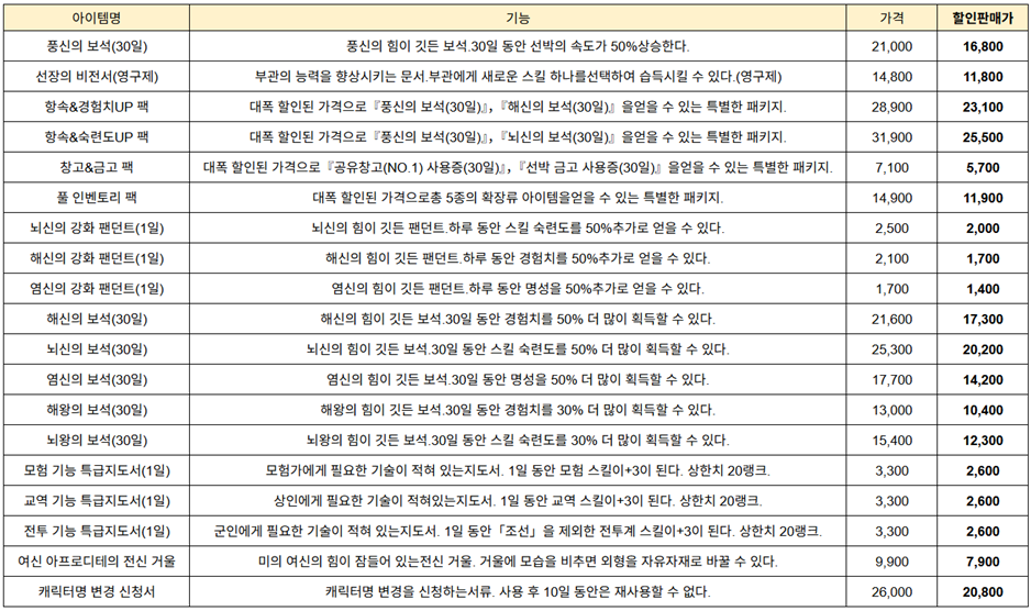 내용 : 할인 판매가 적용되는 아이템은 아래를 참조하시기 바랍니다.
