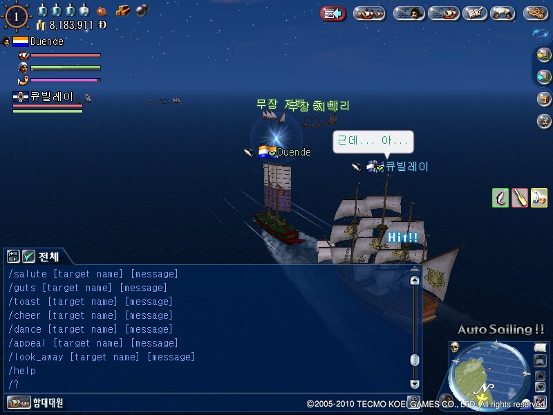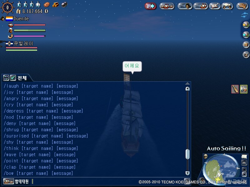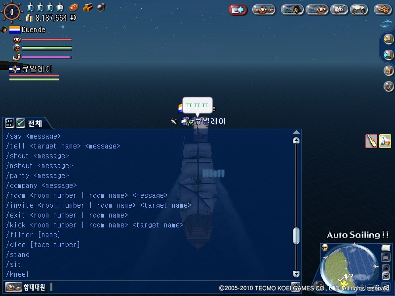 /shout 외치기(같은 구역-건물 안이나 도시 내부, 혹은 일정 거리 이내의 같은 해역-전체를 대상으로 챗)