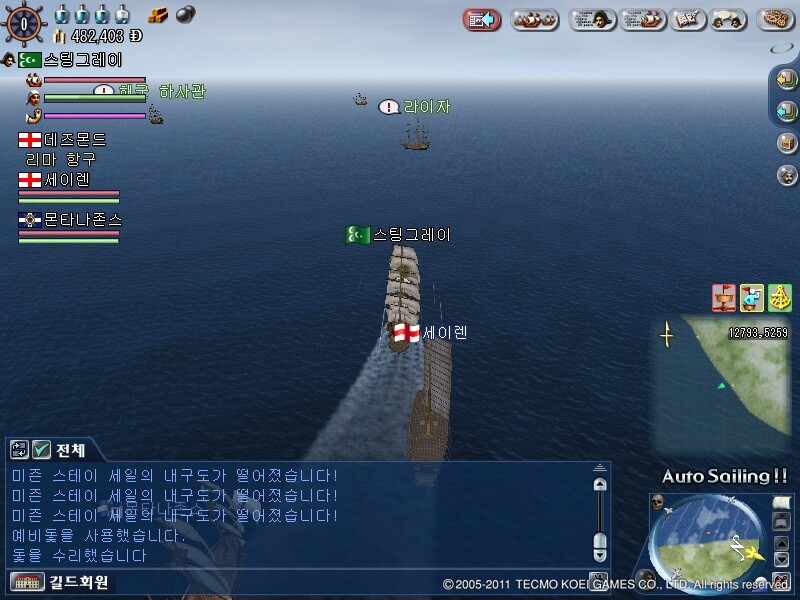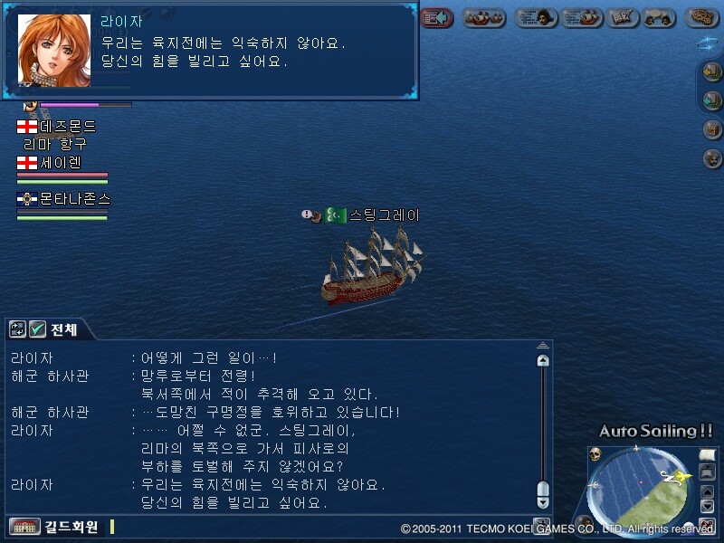 이제 라이자를 도우러 가봅시다 위치는 12500,4670부근에 떠있는 배중 아무거나 클릭하면 전투에 돌입합니다.