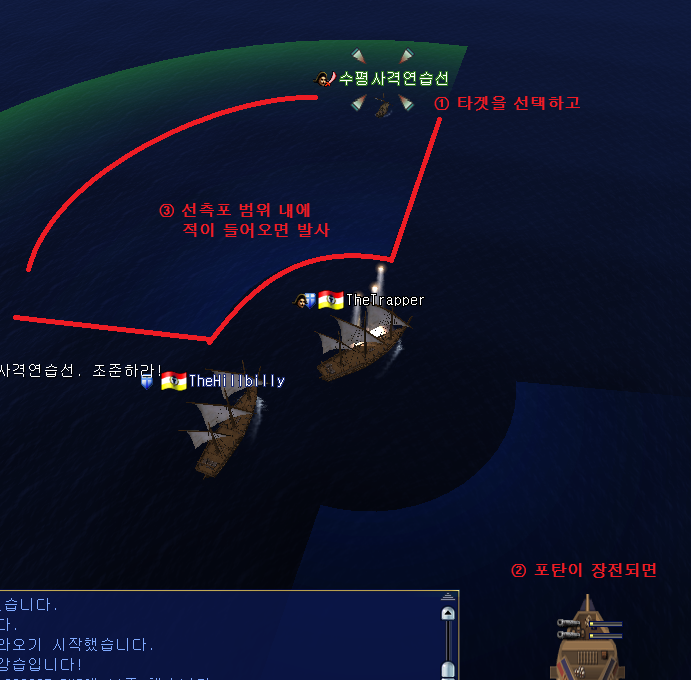 그럼 자연히 저놈들의 선수가 내 쪽을 향하게 되고, 각도를 맞춰 대포를 쏴주면 선수크리로 한방에 격침 가능합니다.