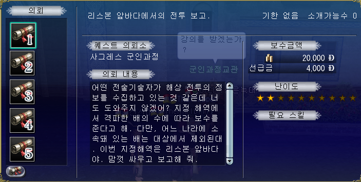 리스본 앞바다에서의 전투보고 퀘스트를 받아줍니다. 그 유명한 해역토벌입니다.