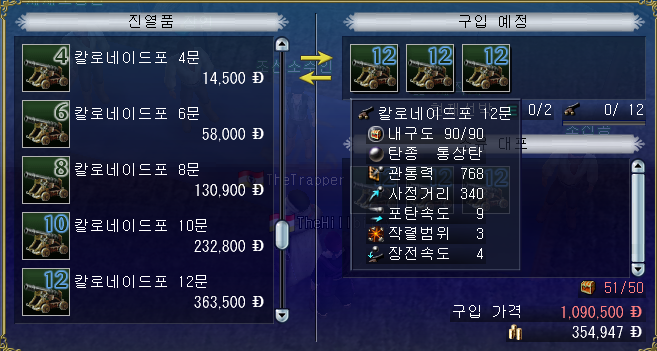 그리고 조선소의 무기 장인에게 가서 [칼로네이드포 12문]을 3정 구입합니다.