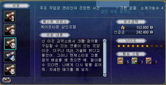 케이프 타운 상인 의뢰 중개인에게 [주조 작업장 관리인의 곤란한 사건] 퀘를 받아주세요.
