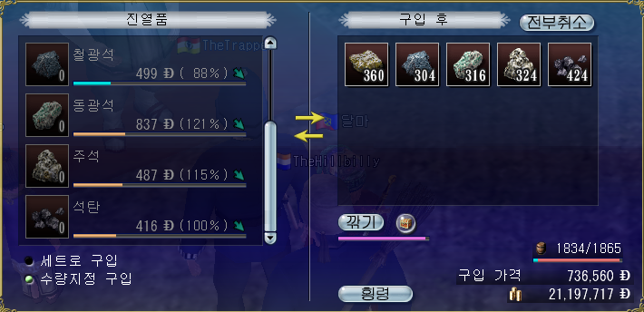 2발을 써서 광석 4종과 석탄을 모조리 사줍니다. 총 적재의 80% 가량.
