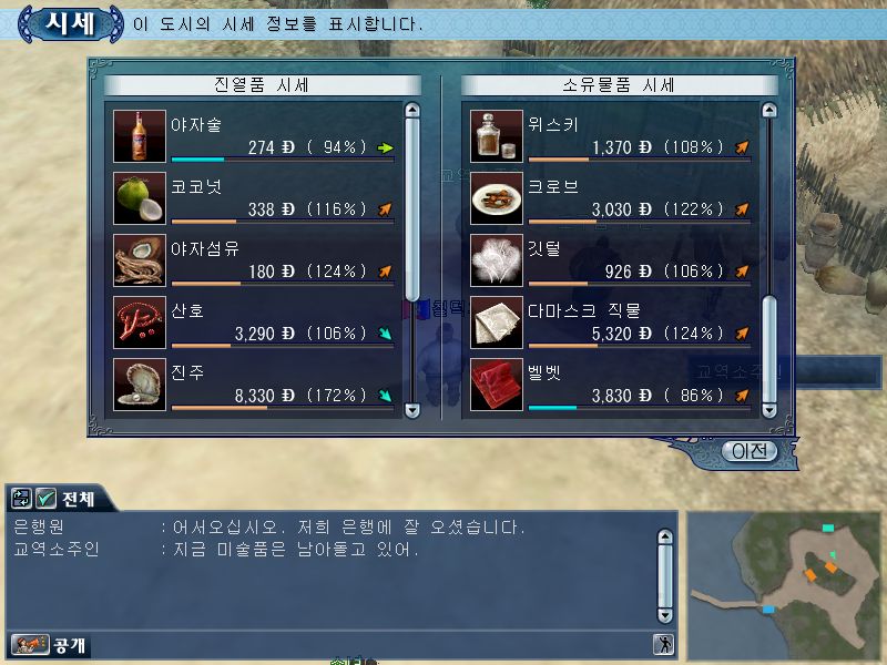 보편적인 물품 (보석,향신료,총포류,세공류,직물류)중에 자신이 가지고 있는 거래랭의 물품들의 시세는 꿰차셔야 합니다.