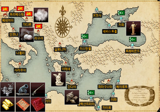 직접 만들어서 폭락을 유도하려면 물품이 이것저것 많습니다만, 대표적으로 제가 폭락작업을 하는 물품들입니다. 자다르의 섬유물품들,제노바와 피사의 벨벳 , 제노바의 은세공, 바르셀로나,세비야의 머스킷총,대포 트리폴리 혹은 알렉산드리아, 베이루트와 라구사를 왕복하여 만드는 네덜란드 편사, 카파와 트레비존드에서 만드는 목상, 아테네 대리석과 목재를 이용한 대리석성이 있는데요.