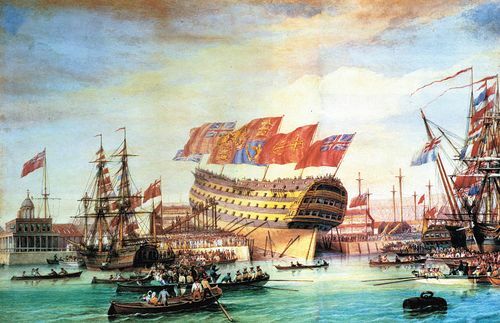 ▲ 1820년 영국해군 트라팔가함의 진수 장면(존 위첼로 작). 혼블로워는 영국 해양력이 대양의 주도권을 쟁취한 시대를 배경으로모험담을 펼친다. |