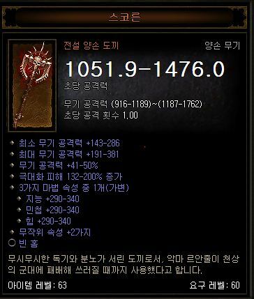 극대화 피해량과 고정 힘옵션이 스코른의 가장 큰 장점인데, 가급적 힘은 300, 극피는 180% 이상을 검색필터에 넣고 가격과 무기 공격력/ 옵션을 봐가며 적절히 판단하는 것이 좋다.