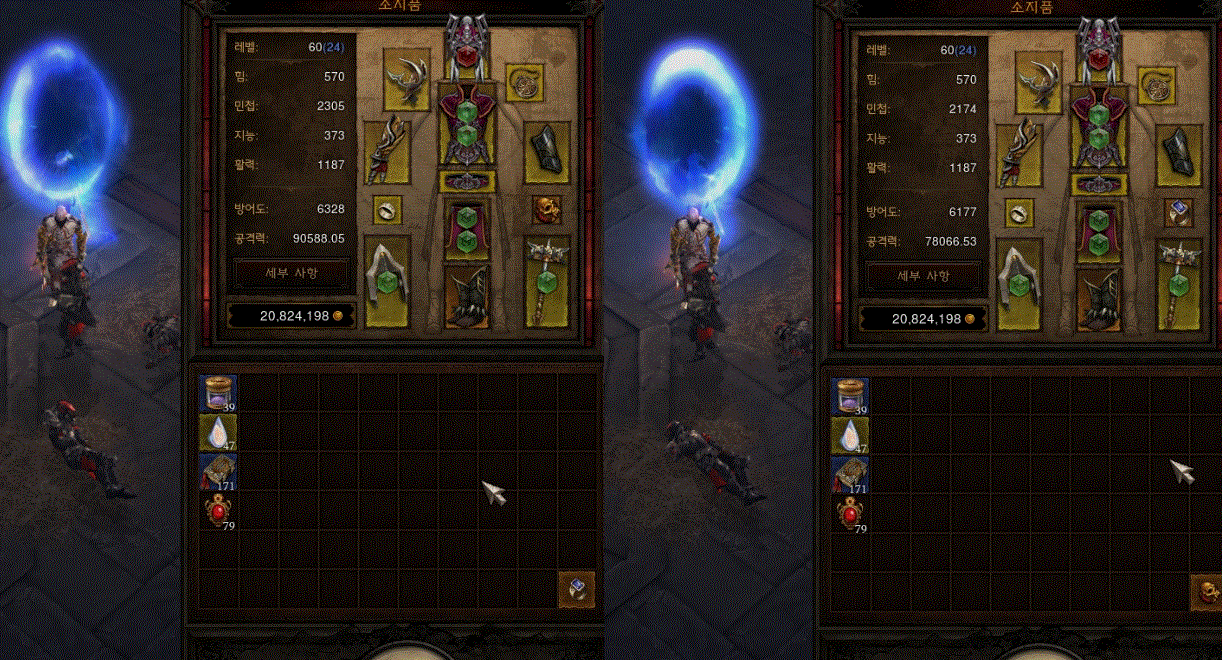 위는 착용 전후 스펙이구여. 디피는 만이천가량 떨어진걸 볼수있내요.