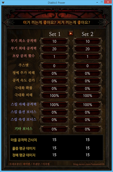 Set 1과 Set 2 글자 사이에 있는 버튼을 누르시면 Set 2에 Set 1 능력치를 복사합니다.