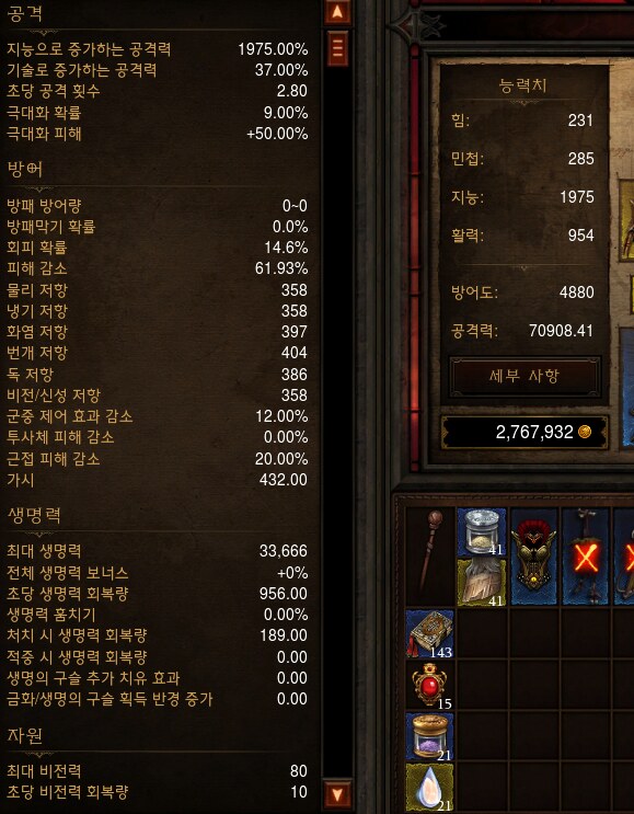 킬할당시 사역마에 공격력 뻥튀기 + 마법무기(가한데미지의 1.5%생명력회복)으로 뻥dps7만이 나왓구요