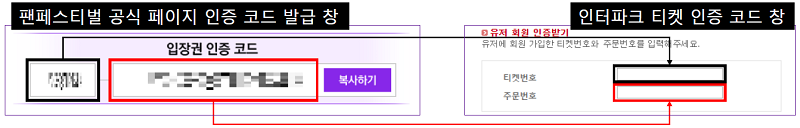 ※ 인증 코드 입력 시 팬페스티벌 공식 페이지에서 받으신 인증 코드는 아래와 같이 입력해 주시면 됩니다.