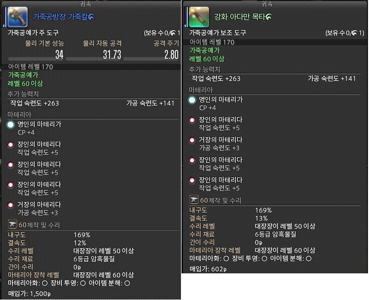 가공숙련은 5 낮고 CP는 4 높습니다. 금단 가격을 생각하면 주무기/보조무기는 적화 교환이 금전적 절약이 됩니다.