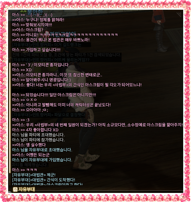 (대법관이 요즘 바빠서 석상이 되어있거나, 로그아웃 할 때가 있습니다. 그럴 때는 오른쪽 하단 플레이어 간 교류 > 플레이어 검색에서 '대법관'이나, 밑에 사진에 출현(?)하는 길드원을 검색하시고(황제펭귄 or 플링 or 아스 or 트리플엑스 or 부처님을 추천) 오른쪽 마우스 버튼 누르셔서 자유부대 가입신청 하시면 됩니다)