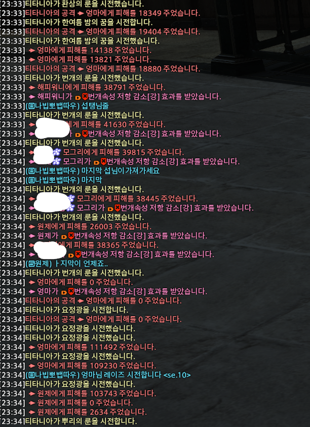 여기서 이 부분만 보면 제가 번개징을 실수한것으로 보이는데 여기에는 작성자분의 오해가 있었다 생각을 합니다. 이 때에 저는 앞서 1요정광때 죽은 전사 대신에 어그로를 끌고 있던 상황이였습니다. 전사님이 다시 어그로를 가져가시겠지 생각했지만 충분히 시간이 지나도 어그로를 다시 가져가지 않으셔서 제가 계속 가지고 있는 상황이었습니다. 전사님이 첫번째 번개징을 처리하실 줄 알고 그냥 어글을 가지고 징을 빼는것을 기다리고 있었는데, 전사님이 처음 징을 가져가지 않으셔서 징 순서가 꼬여서 순간 놀라 6번째 징을 가져오고 무적기인 폭발유성을 눌렀습니다. 요정광을 앞두고 생각없이 누른것은 사실이므로 제가 잘했다고는 생각하지 않지만 오해의 요소가 있어서 글을 씁니다.