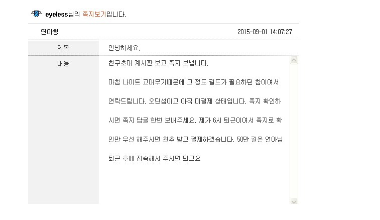 작성한 오딘서버 50만길 지원 글이 있었습니다. 마침 나이트 고대무기를 위해 그 정도의 길이 필요하기에 쪽지를
