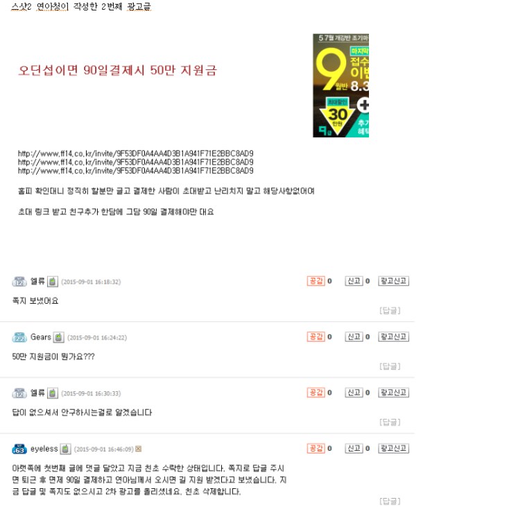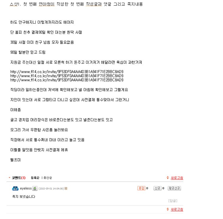 으로 올리셨고요. 첫번째 광고글에 올린것처럼 회사여서 파판인벤에 접속할 수 없는 상황이 아니셨던거죠.