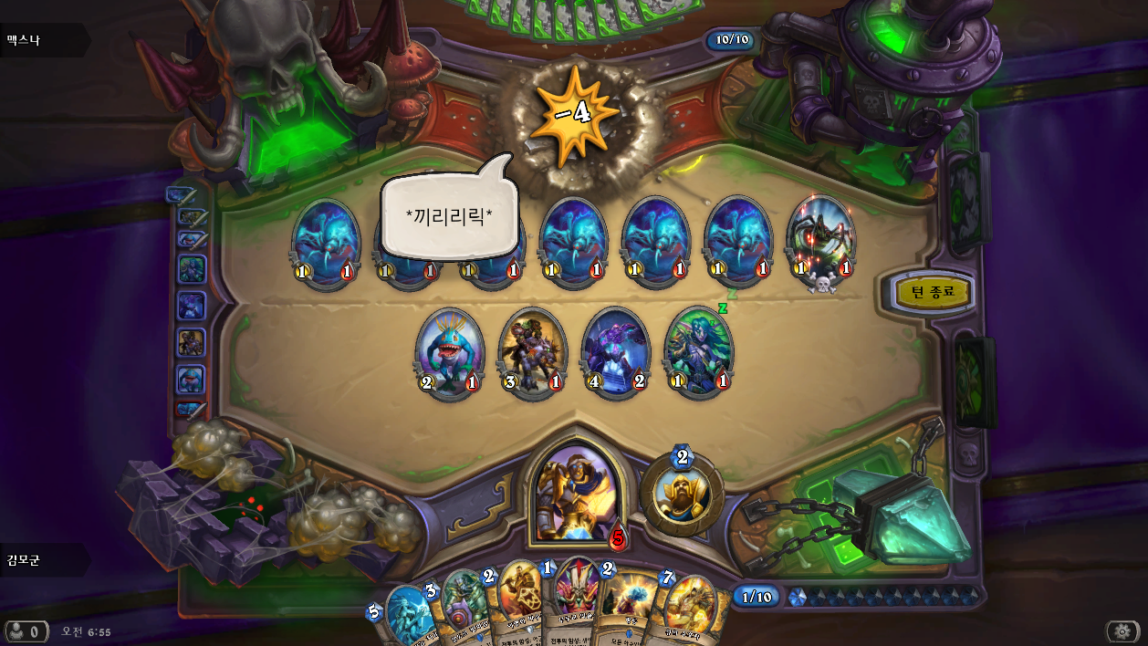 4마나 타이밍에 무조건 리로이 젠킨스가 잡혀야 냥꾼이 죽기전에 리로이 꺼내고 받고 꺼내고 받고를 반복해 내가 죽기 전에 맥스나를 죽일 수 있습니다 고정사격과 개풀을 섞어주면 더 빨리 끝낼 수 있습니다