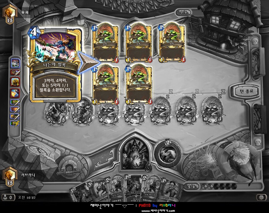 상대 주술사는 타우렌 전사를 뽑았네요. 저는 멀록 카드를 받았습니다.