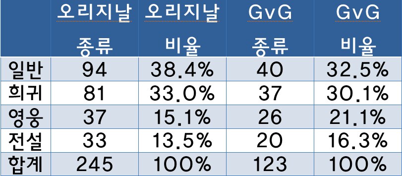 - 이외에도 여러 통계를 통해 특정 카드 한장이 전설이 될 확률과 그 전설 중 특정 1종이 될확률은 독립변수라고 보는게 옳습니다.