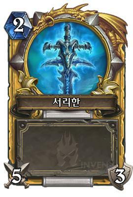 아서스가 주는 카드인 서리한은 영혼을 속박하는 능력을 죽메로 다시 소환하는 효과로 구현되어 있습니다. 앞서 티리온이 파괴했지만 그 잔여물의 행방은 묘연했고 군단에서 서리한의 파편을 재가공해서 냉기 죽음의 기사의 쌍검"타락한 왕자의 칼날" 얼음인도자와 서리수확자로 다시 탄생합니다. 그 과정에서 아서스의 영혼이 서리한 그 자체에 속박되어 있는 걸 볼 수 있습니다.