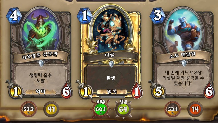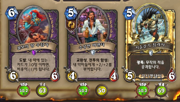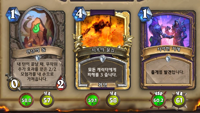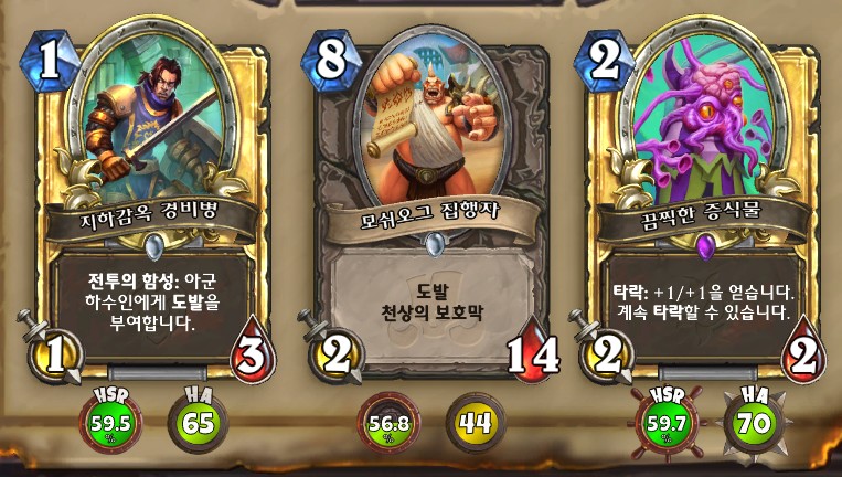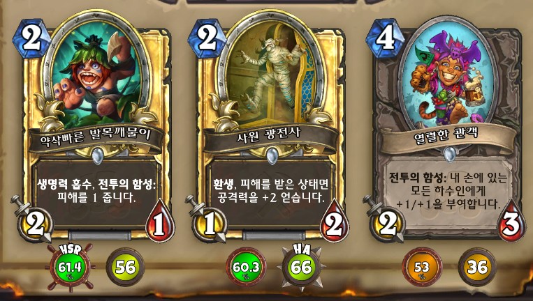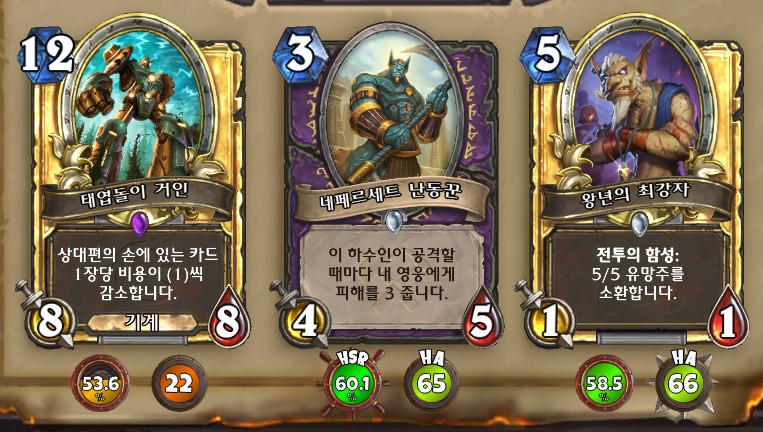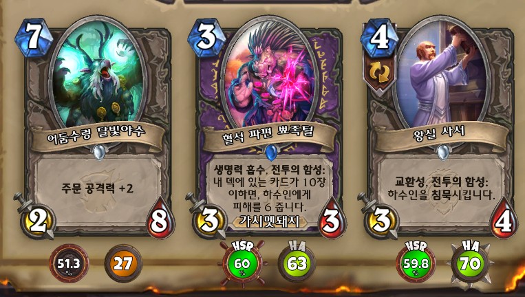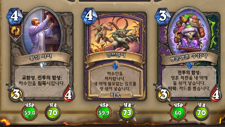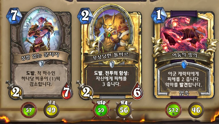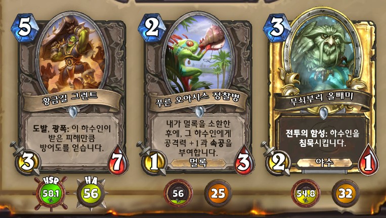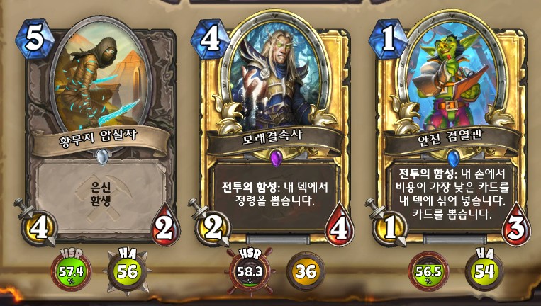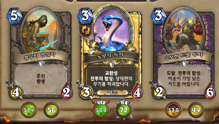 3. 황무지 암살자 방금 뽑았는데. 어째서 잔상이 보이는 걸까요. 오른쪽에 흑마법사 카드가 나왔습니다. 라스타칸의 대난투 카드인데요. 카드를 버리는 컨셉은 신통치 않습니다. 좋은 3코 하수인을 집습니다. 녹부식 독사 선택