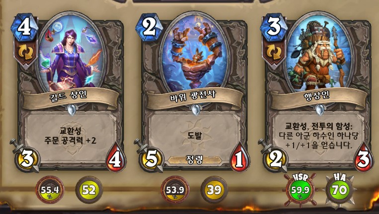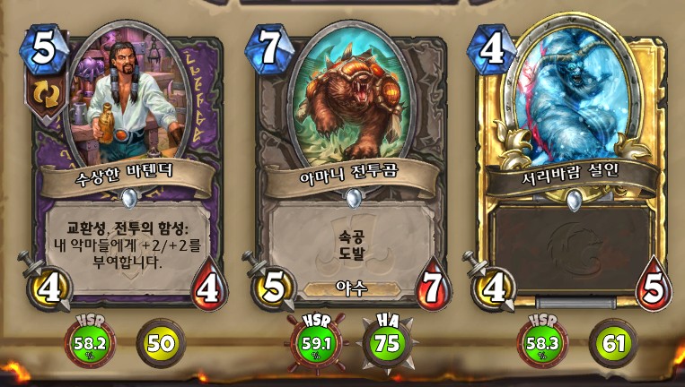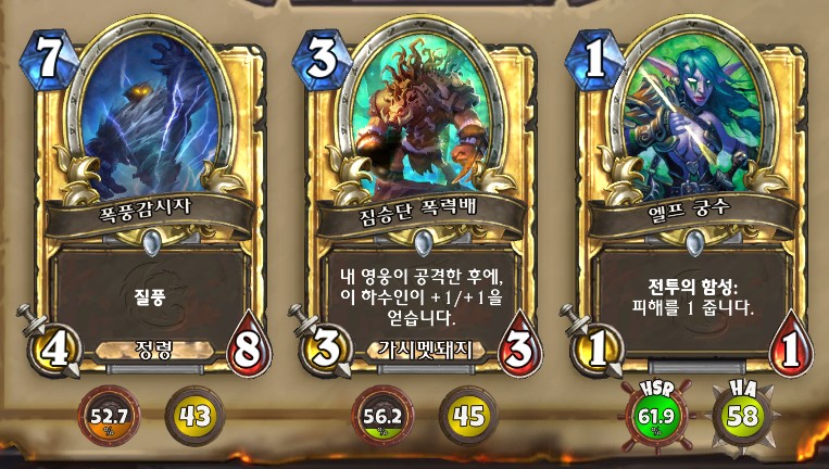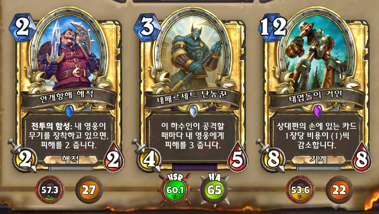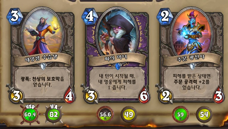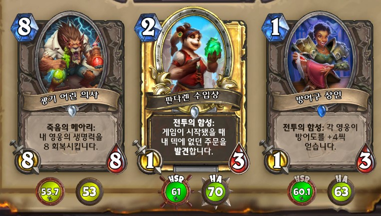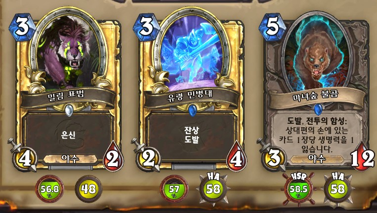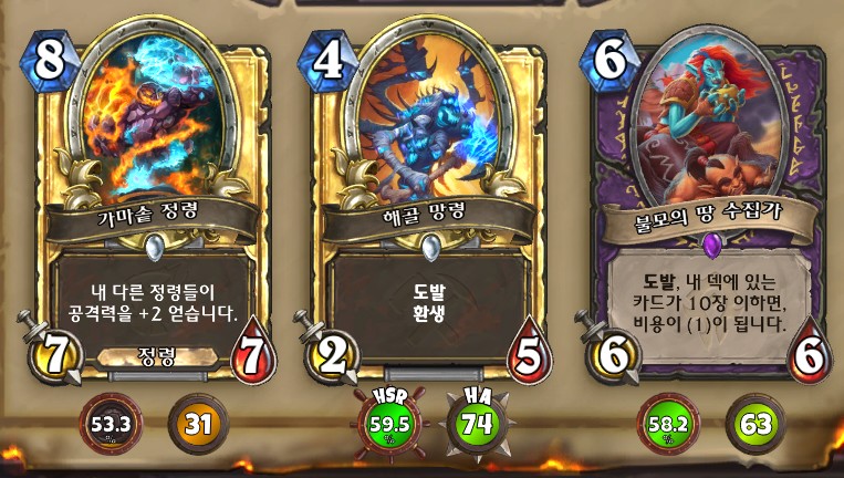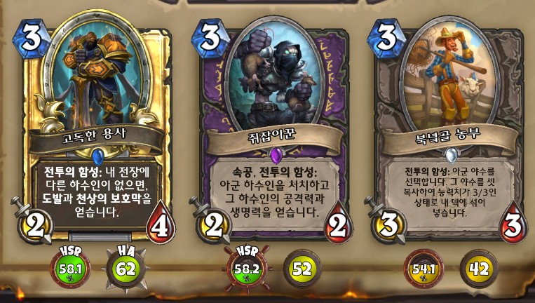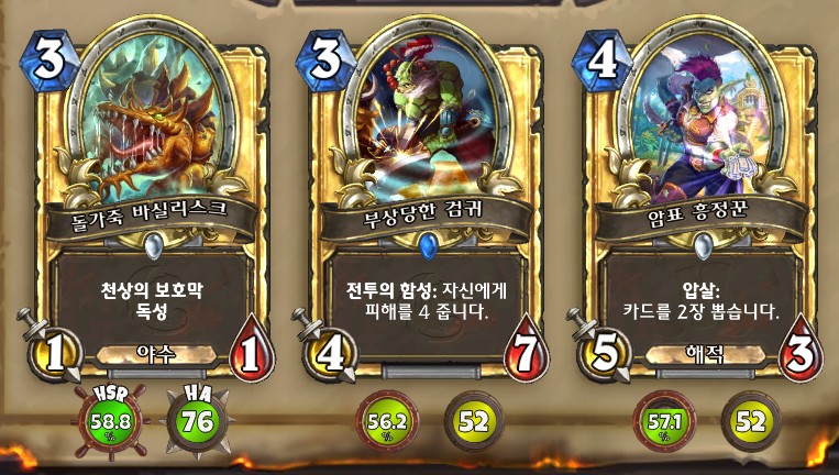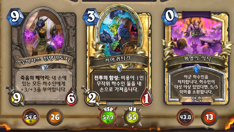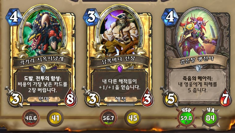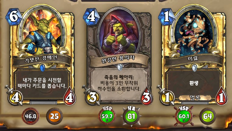 3. 황무지 암살자 방금 뽑았는데. 어째서 잔상이 보이는 걸까요. 오른쪽에 흑마법사 카드가 나왔습니다. 라스타칸의 대난투 카드인데요. 카드를 버리는 컨셉은 신통치 않습니다. 좋은 3코 하수인을 집습니다. 녹부식 독사 선택