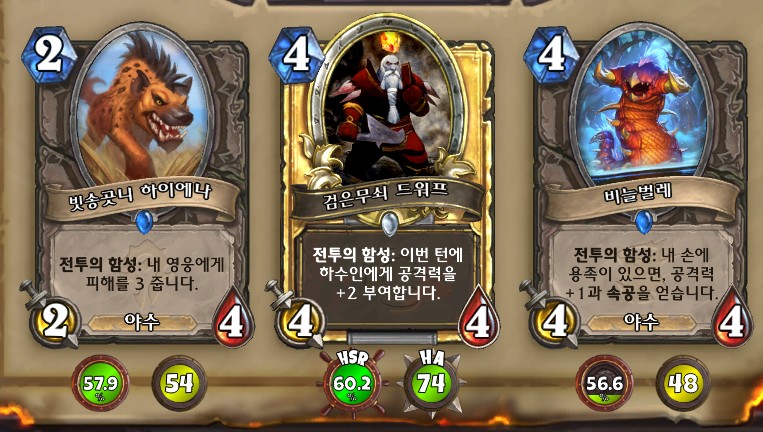 19. 2, 4코 하수인. 2코 하수인을 집을 기회입니다. 빗송곳니 하이에나 선택. 스탯에 집중한 빗송곳니 하이에나, 네페르세트 난동꾼을 구했습니다. 우리가 이기는 방법을 이걸로 잡아야 할 겁니다.