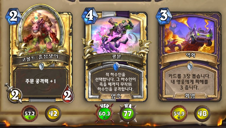 22. 안 좋은 카드 세 장입니다. 우리 덱에서 가장 쓸 수 없는 카드인 광분을 제외하면 코볼트와 역화가 남습니다. 역화는 안 좋은 픽에서 집는 카드라 이런 상황에서 집곤 합니다. 그런데 우리 덱은 하수인이 필요할 것 같습니다. 이 중에서 하수인을 고르면 코볼트 밖에 없습니다. 주문도 없는데. 2코 하수인. 코볼트 흙점쟁이 선택
