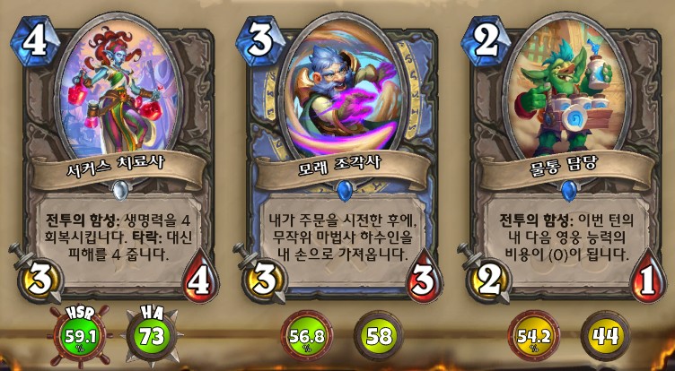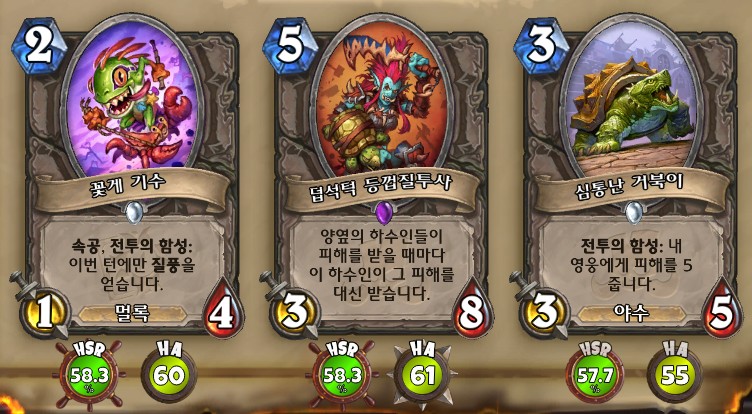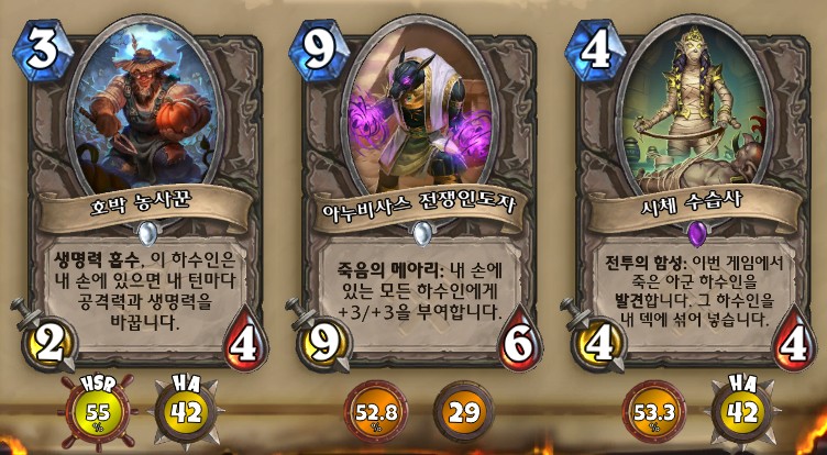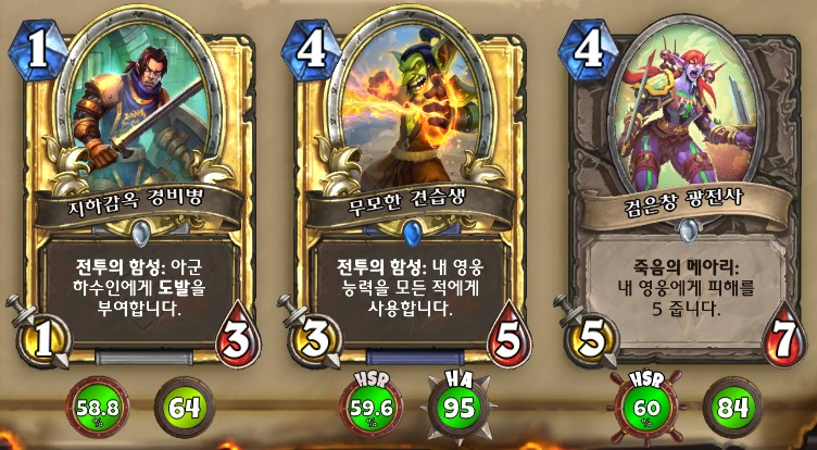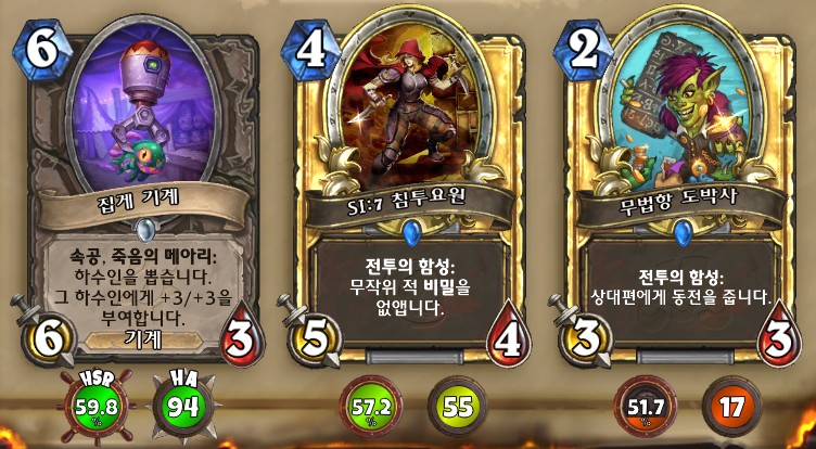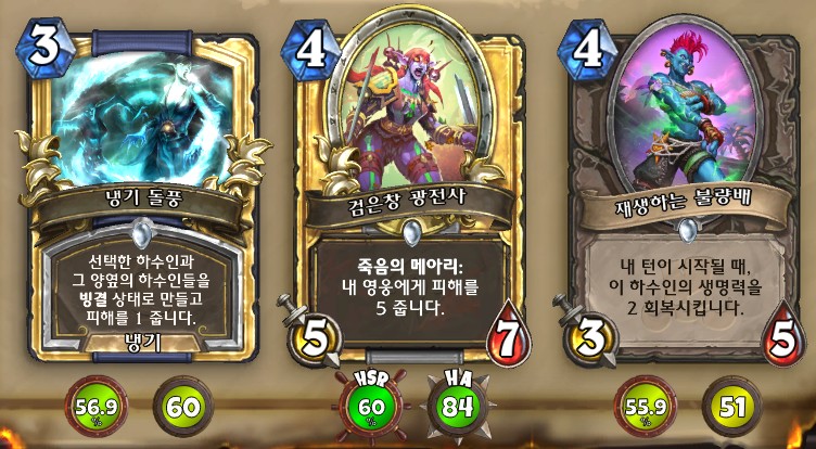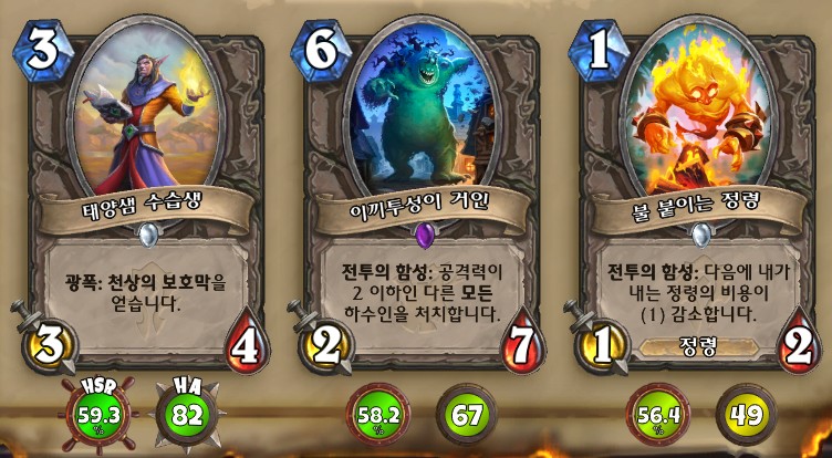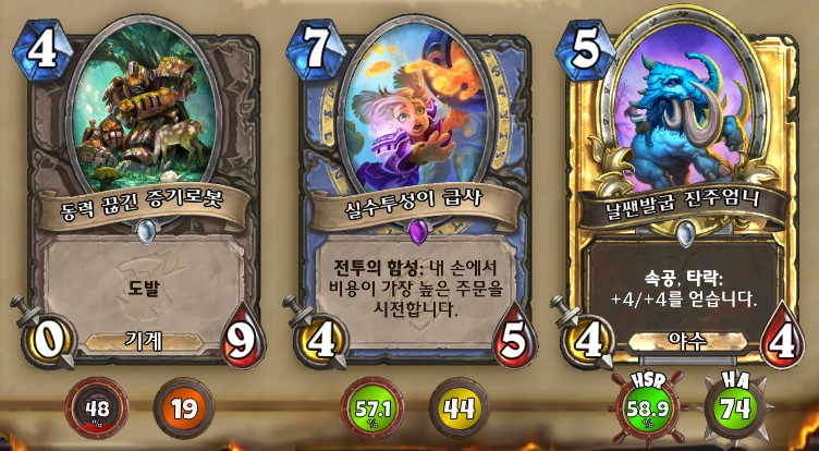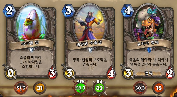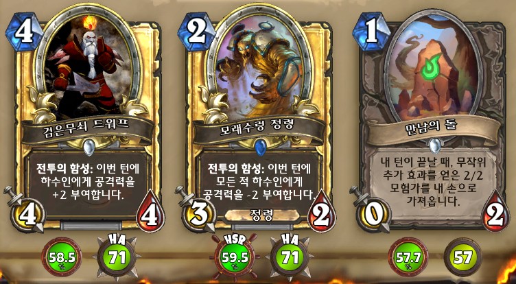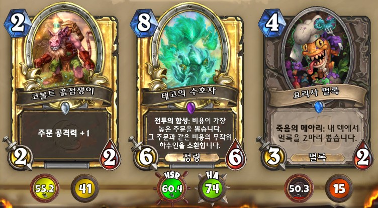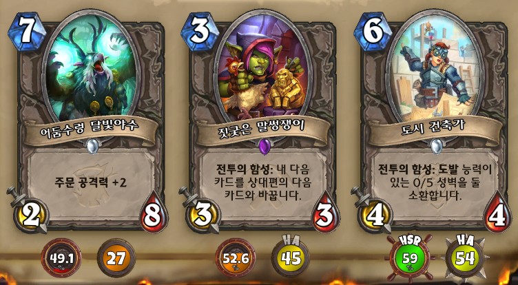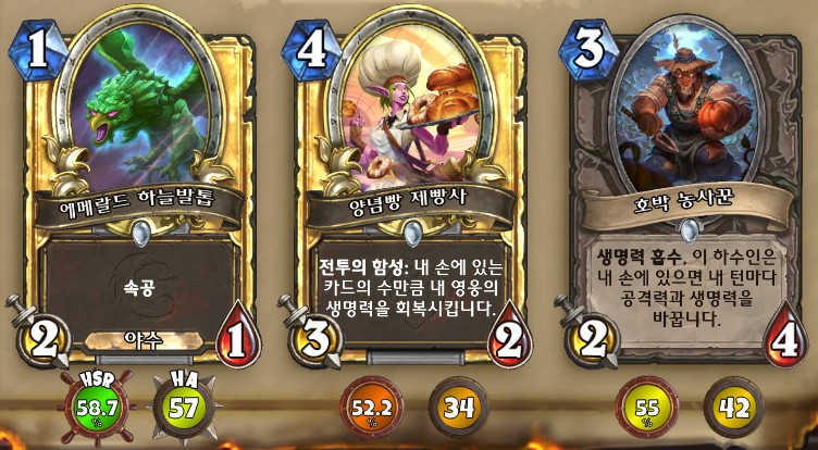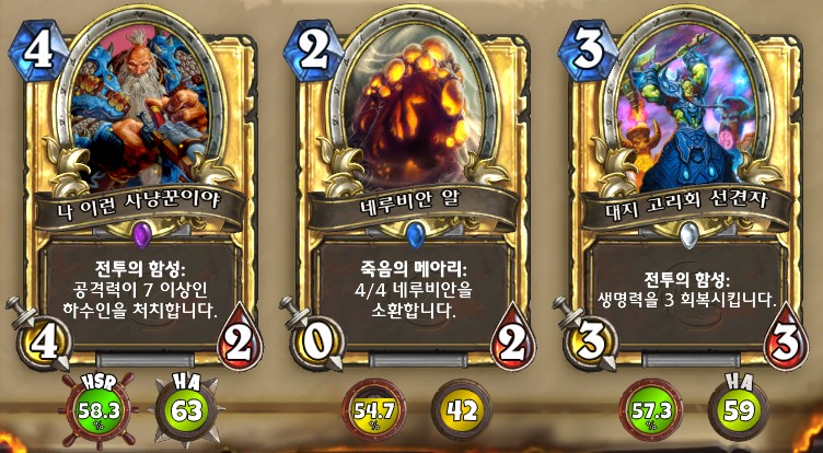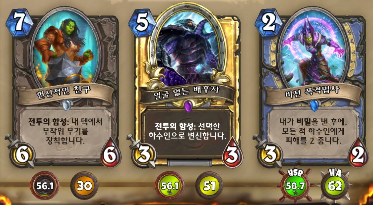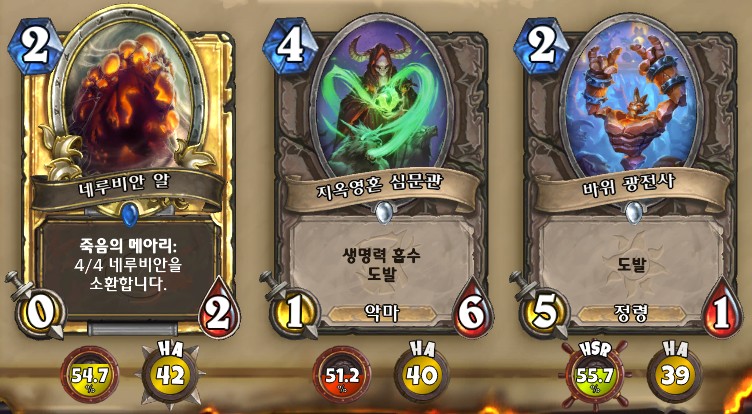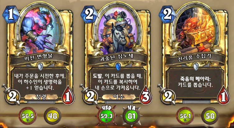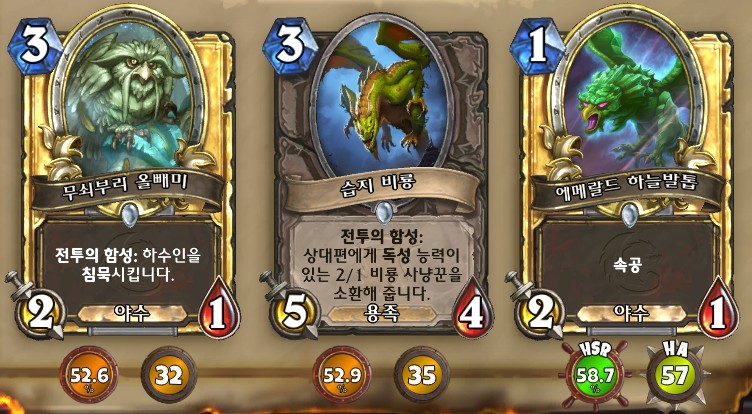 2. 그리핀의 해 핵심 카드 팩. 나이사 같은 특급 카드가 자주 나오면서 요즘은 공격력 7 이상을 내면 나이사에 자주 죽습니다. 하지만 이런 건 컨트롤 덱에서나 쓰는 카드입니다. 선견자를 집는 게 평균 승률에 도움이 될 것 같습니다. 대지 고리회 선견자 선택