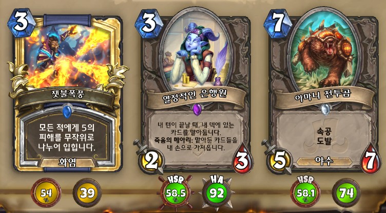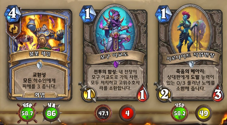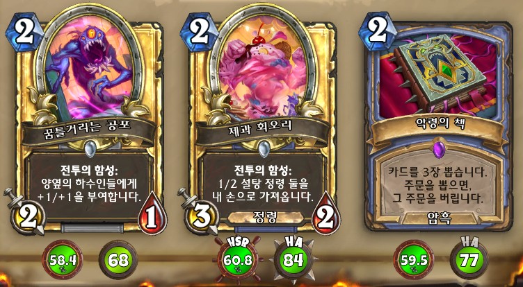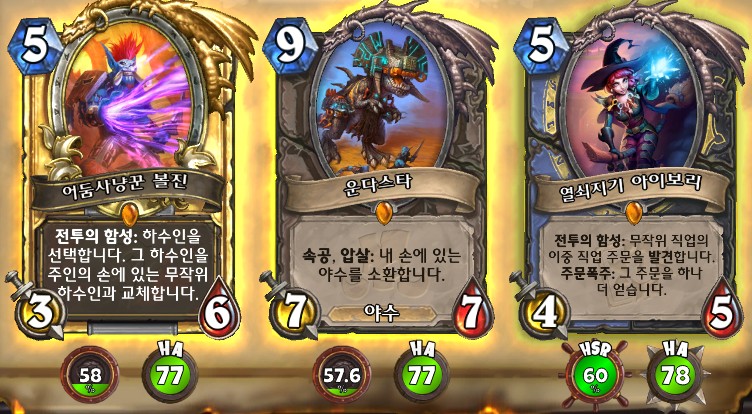 1. 마녀숲 법사 카드는 악령의 책, 비전 열쇠공 말고는 쓸 게 없습니다. 중립 두 장은 쓸만합니다. 속공, 도발을 집었습니다. 아마니 전투곰 선택
