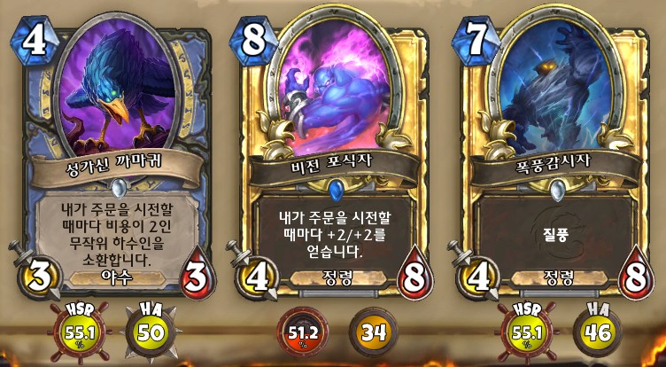 8. 아이고. 마녀숲 법사 카드에, 핵심 7, 8코. 까마귀와 폭풍감시자 중에서 골라야 합니다. 7, 8코스트 벌써 하나씩 집었는데요. 아 싫다. 성가신 까마귀 선택