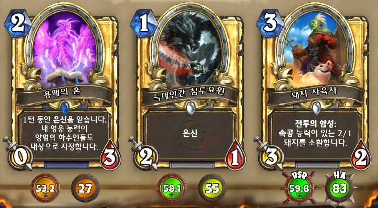 12. 또 법사 카드 이상한 거 나옵니다. 1코 하수인과 속공. 고급 3코 하수인은 욕심이 납니다. 돼지 사육사 선택