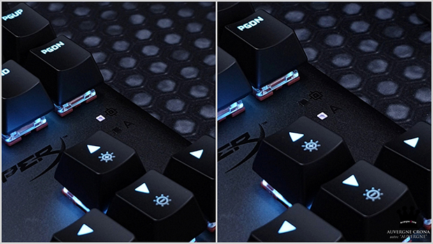 ▲잠금 키 활성 여부는 방향키 위에 흰색 LED 인디케이터를 통해 확인할 수 있는데요. 독특하게도, HyperX 제품은, Alt + F4나 Alt + TAB 키 조합같이, 긴박한 게이밍 중에 방해가 될 수 있는 키를 게임 모드라는 기능을 통해 잠글 수 있습니다. 인디케이터로 확인도 가능하네요.