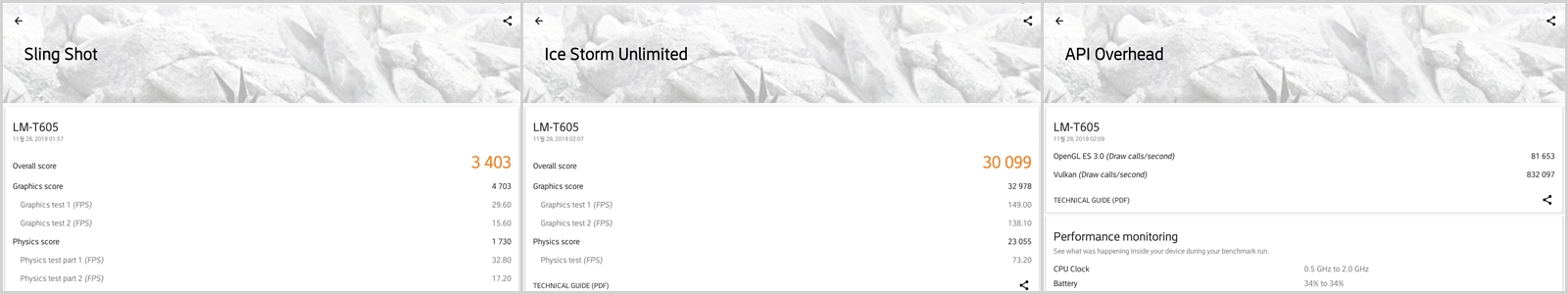 ▲ 3DMark의 벤치마크도 진행해봤습니다. Sling Shot과 Ice Storm, API Overhead를 통해 측정을 진행했습니다.