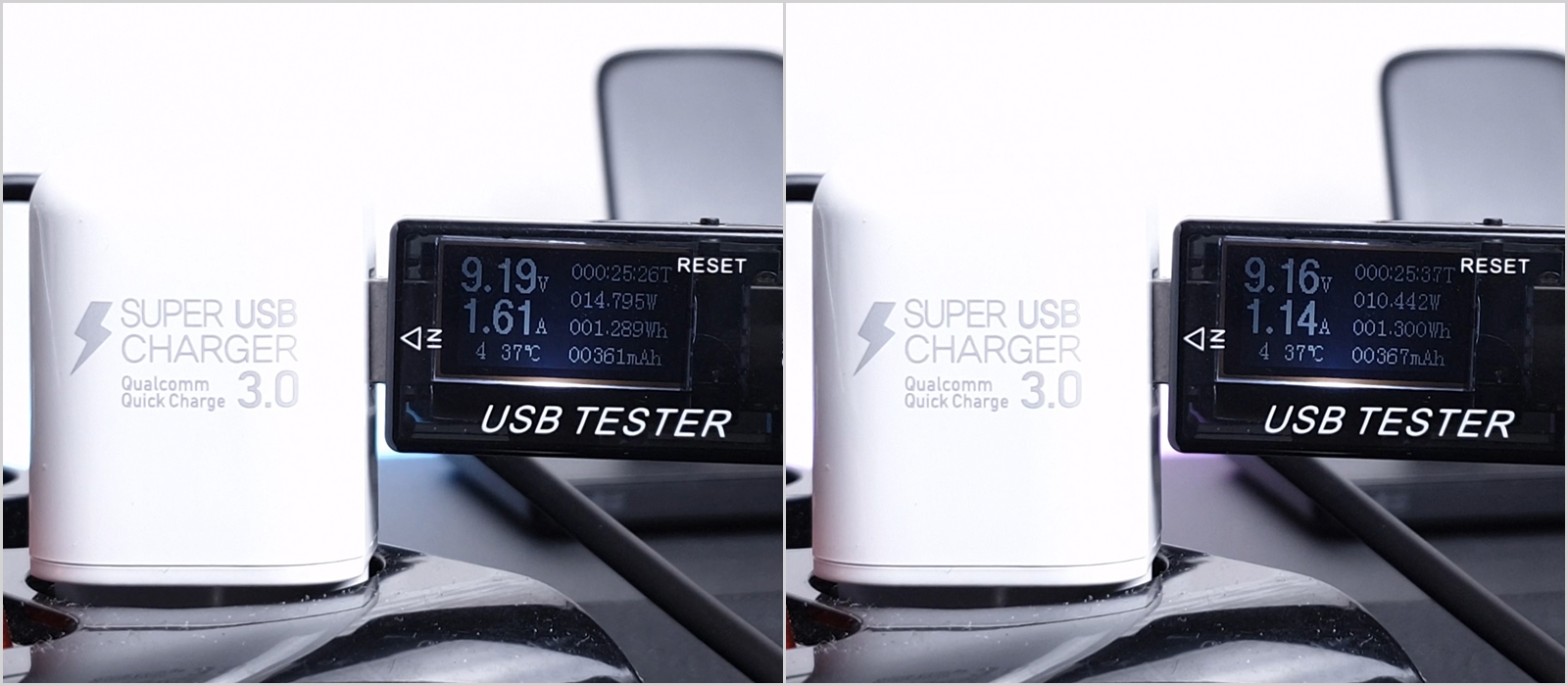 ▲ 별도로 사용 중인 어댑터와 충전 케이블을 가지고, 충전 시 소비 전력을 측정해봤습니다.