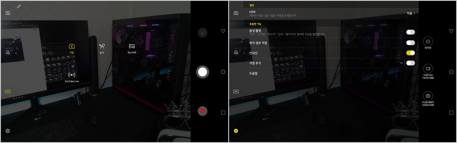 ▲출력물의 퀄리티는 적당한 수준으로, 간단하게 촬영하기에 적합합니다. 카메라는 HDR과 안내선, 위치 정보 설정 등이 가능하고, 자동 모드와 파노라마, 유튜브 라이브 모드로 나뉘어 있습니다.