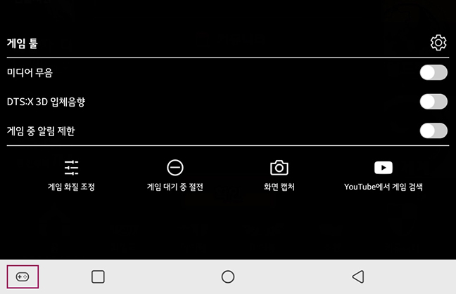 ▲또한, 게임 중에 언제든지 좌측 하단의 홈 터치 바에서 게임 툴 버튼을 눌러, 게임 중 편의 기능들을 사용할 수 있습니다. 게임 도중, DTS:X 3D 입체음향 효과나 푸시 알림을 제어할 수 있고, 게임 공략이 필요한 경우, 유튜브 검색을 이어나갈 수도 있으며, 별도의 프로그램 없이도, 화면을 캡처하거나 녹화를 진행할 수 있습니다.