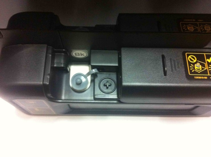 잉크 탱크 커버를 뒤로 밀면 잉크 마개로 닫혀있는 잉크 탱크가 들어납니다. 누수의 가능성이 존재하는 무한잉크와는 차별하되어