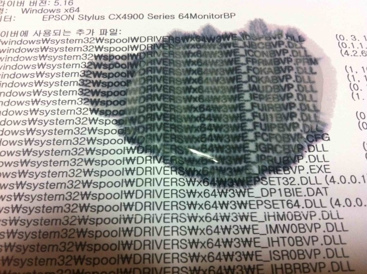 우선 CX4900 으로 인쇄한 결과물에 물을 부었습니다. 손으로 문지르고 할 것도 없이 바로 잉크가 번졌습니다.