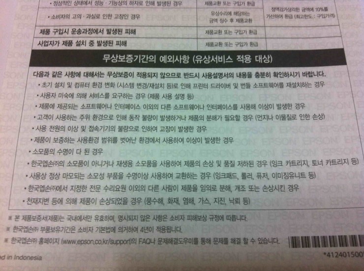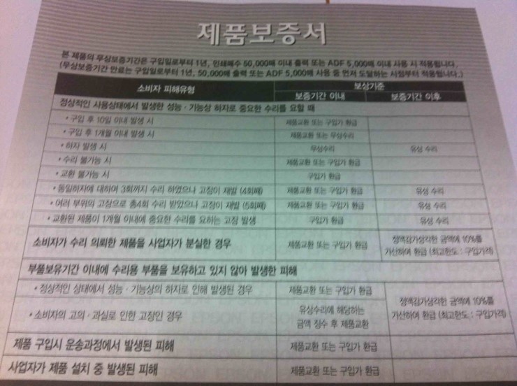 제품 보증서에는 무상보증기간과 보상기준 , 유상서비스 적용대상등을 알기 쉽게 적어두어 혹여 발생할수 있는 고장시