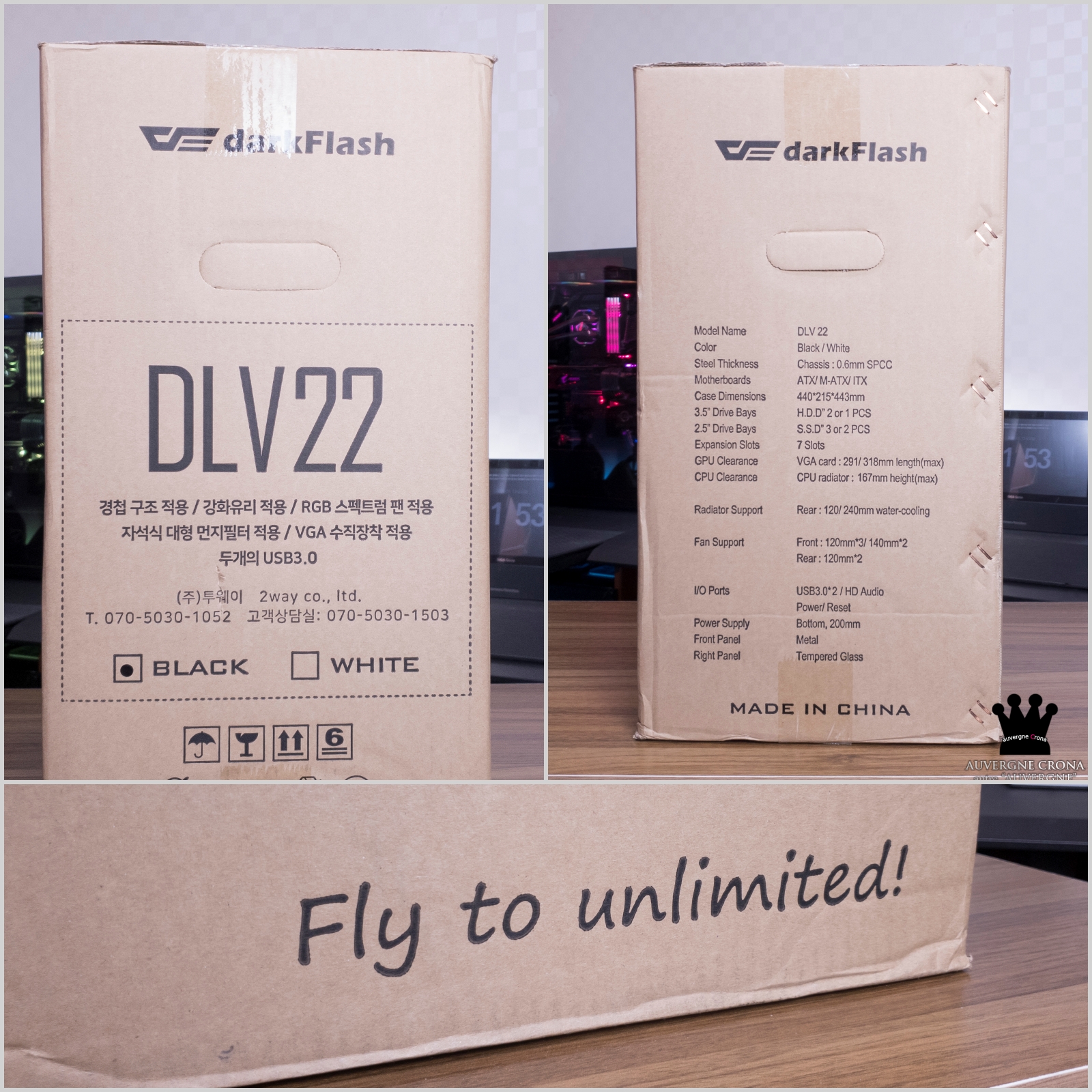 ▲ 패키지는 전용 패키지가 사용되었습니다. 측면에 제품의 색상이 별도로 체크되어 있고, 반대쪽에는 상세 스펙이 기재되어 있네요. 또, 측면 상단 쪽에 손잡이를 구성해, 운반에 용이하도록 했습니다. 전면 하단에는 Fly to unlimited라는 문구가 기재되어 있는 게 눈에 띄네요. 소비자가 원하는 제품을 끊임없이 연구한다는 다크플래쉬의 슬로건인데, 아주 좋은 마음가짐이죠?